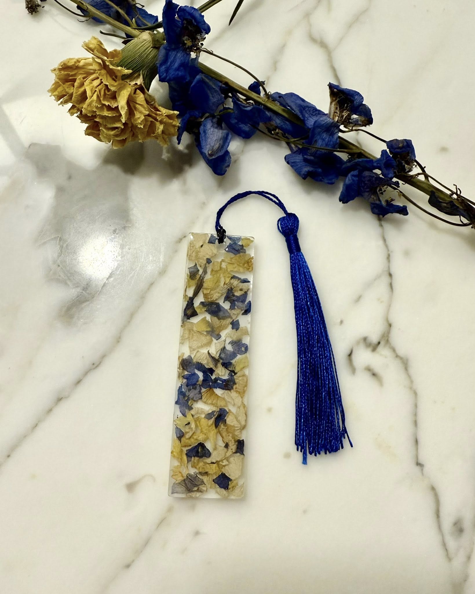 Mark your place in your favorite books with a personalized bookmark. Our "flower confetti" offers a beautiful and unique filler for these bookmarks, but we can also press smaller flowers to include for a more custom touch.